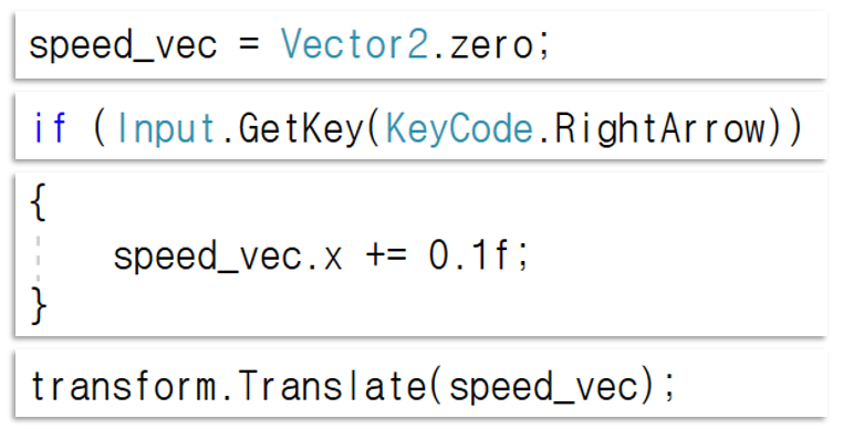 오른쪽 방향키를 누르면 (0.1, 0)로 바꾸는 식으로 캐릭터 조작을 만들 수 있겠죠?