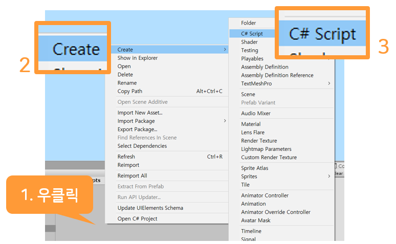 그리고 안에 C# Script를 만들어주세요.