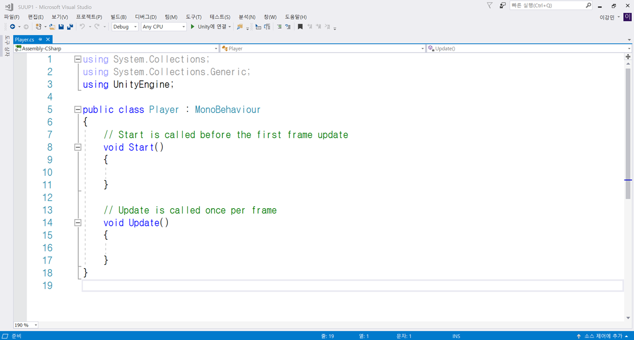 Start 함수와 Update 함수는 유니티에 기본 기능으로 들어있는 특별한 함수 중 하나입니다.