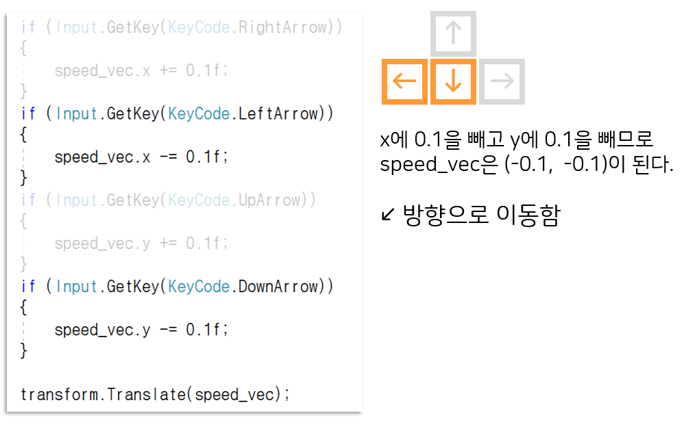 따라서 오른쪽 키를 눌렀다면 (0.1, 0)만큼 움직이며,