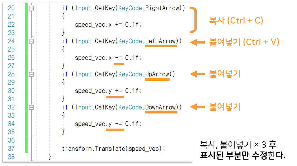 (오른쪽 키가 눌렸다면) speed_vec 변수의 x 부분에 0.1을 더한다.