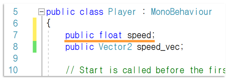 스크립트를 저장했을 시, 유니티에 돌아오면 저렇게 Speed_vec 변수가 나타납니다.