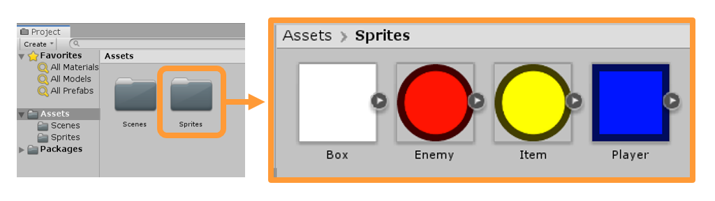 Sprites 폴더를 더블클릭하면 그 안에 들어있는 스프라이트(이미지 파일)들이 나옵니다.